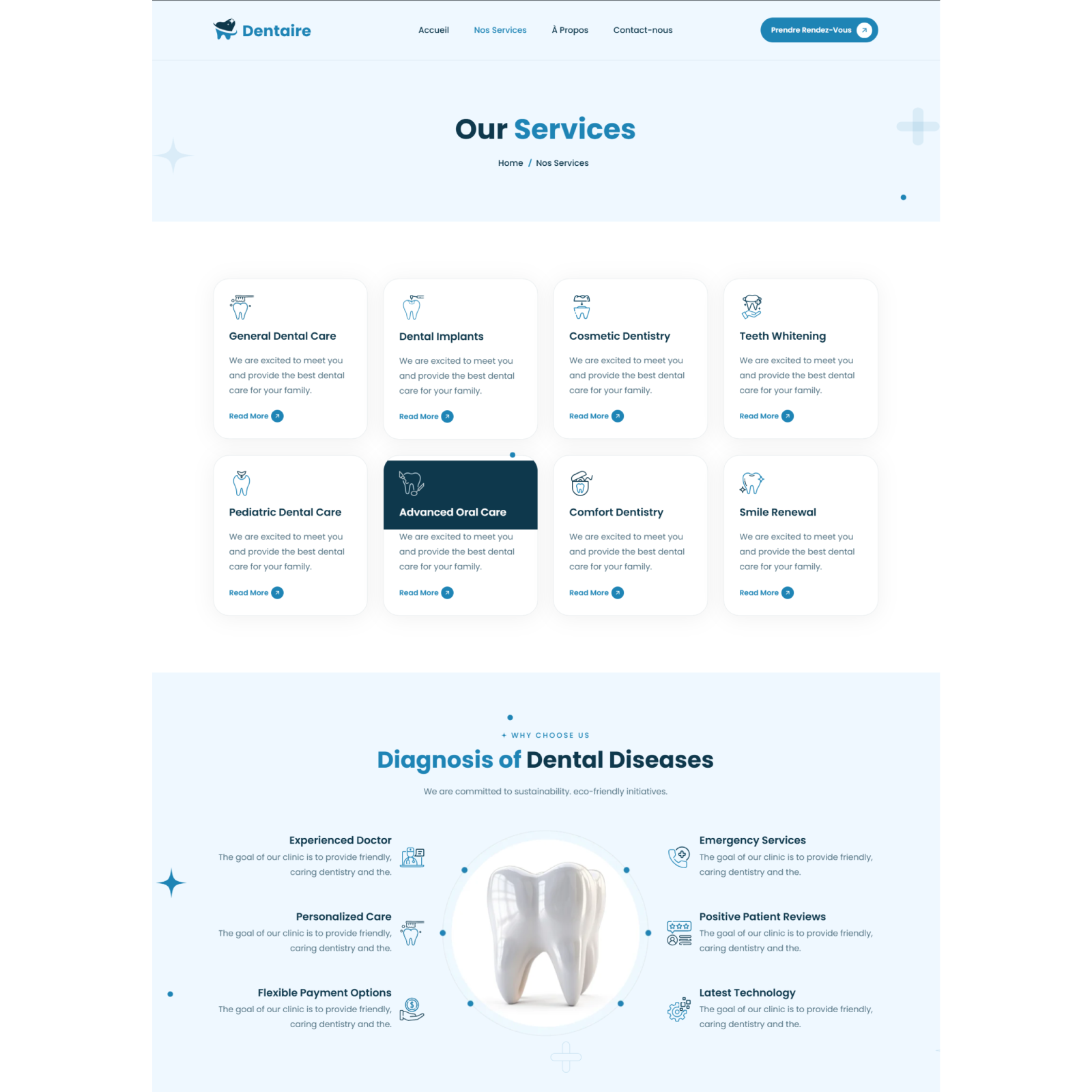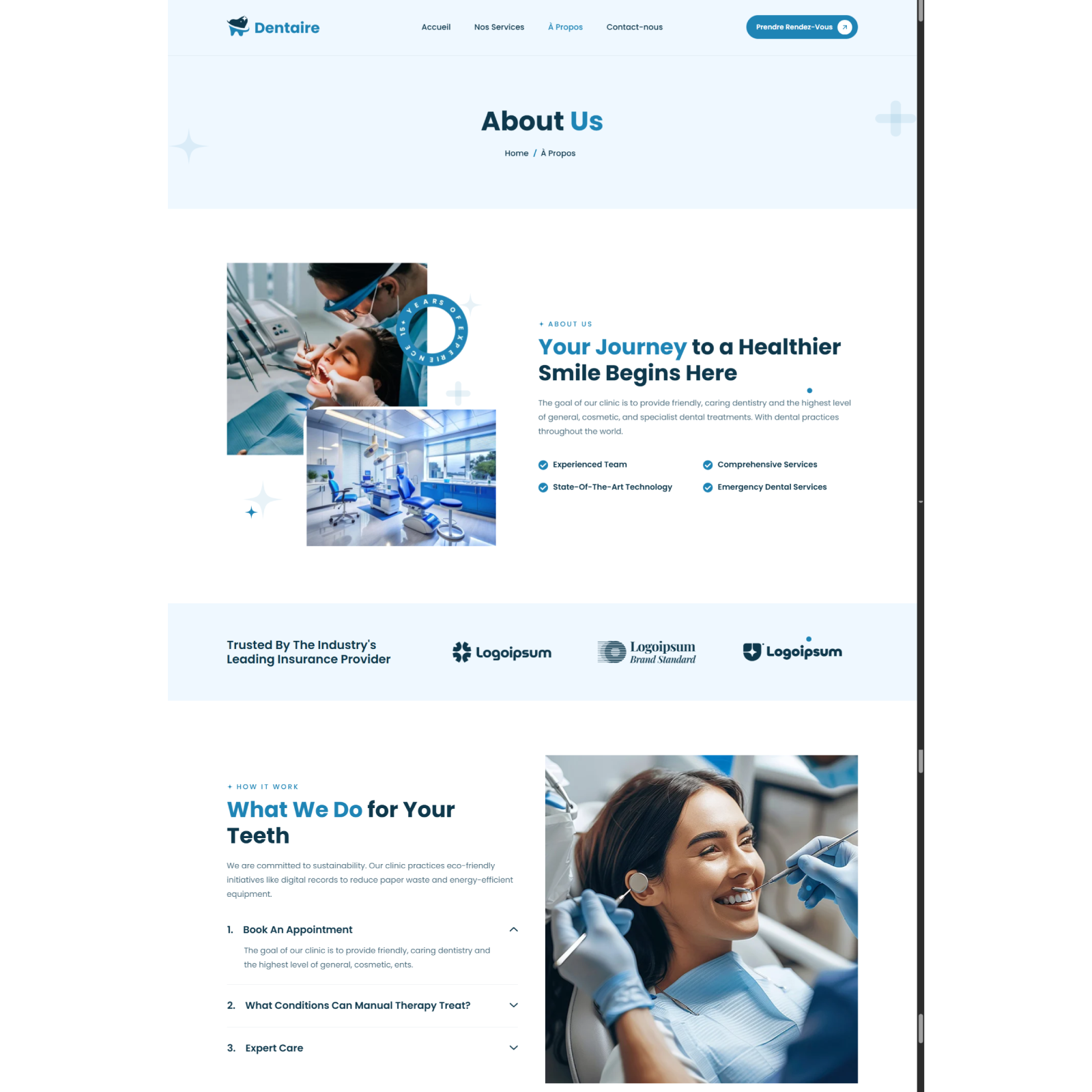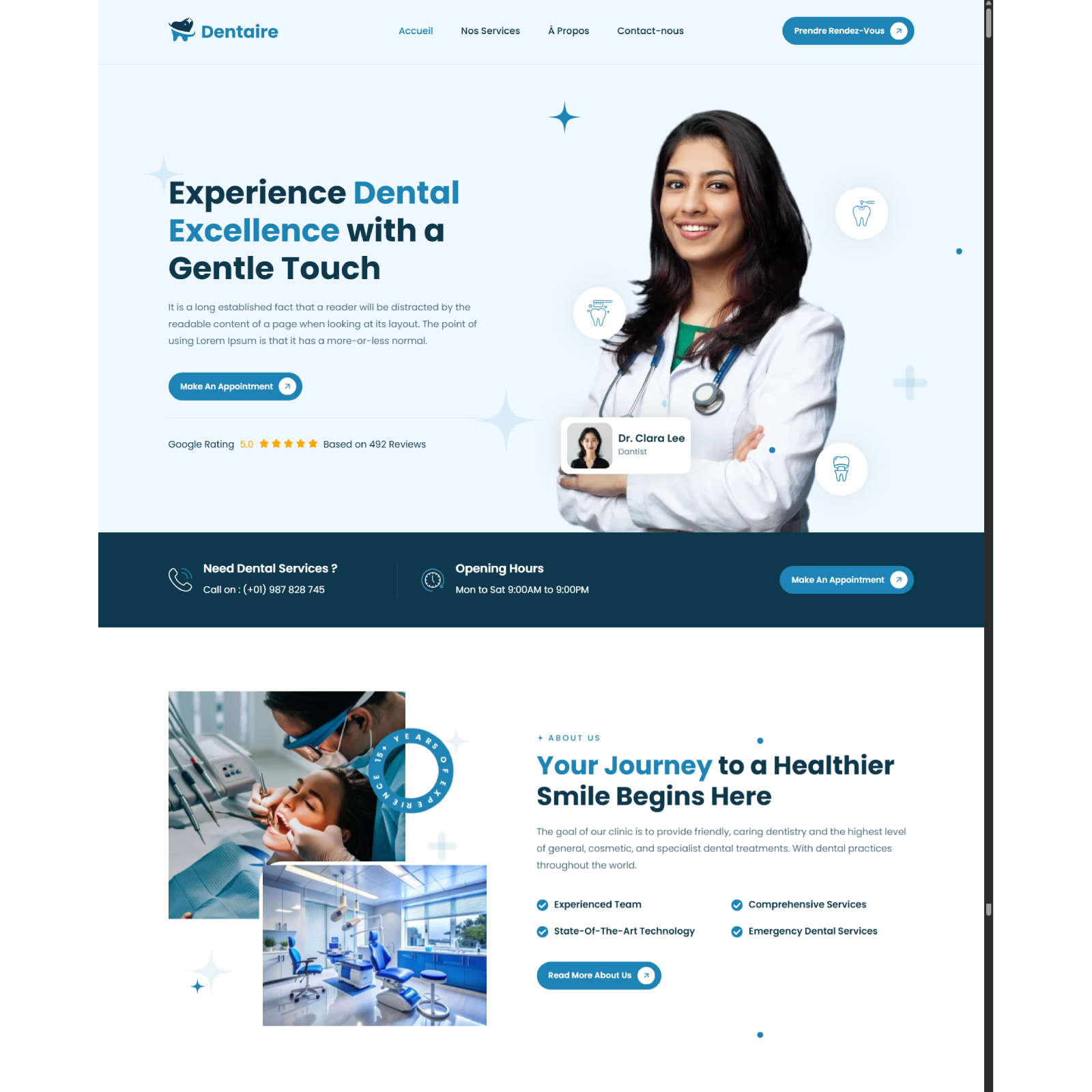 Conçu pour fluidifier la prise de rendez-vous : formulaire simple, intégration WhatsApp et rappels automatiques. Présentation claire des services et accès rapide aux informations pratiques. 100 % personnalisable pour adapter les workflows aux besoins du cabinet et simplifier la gestion quotidienne.