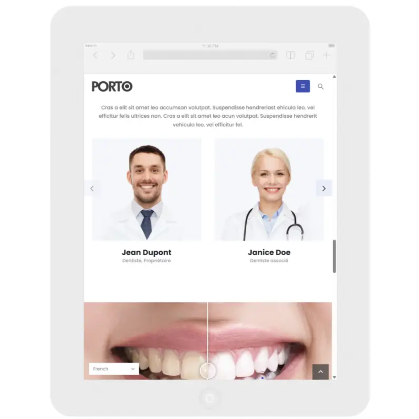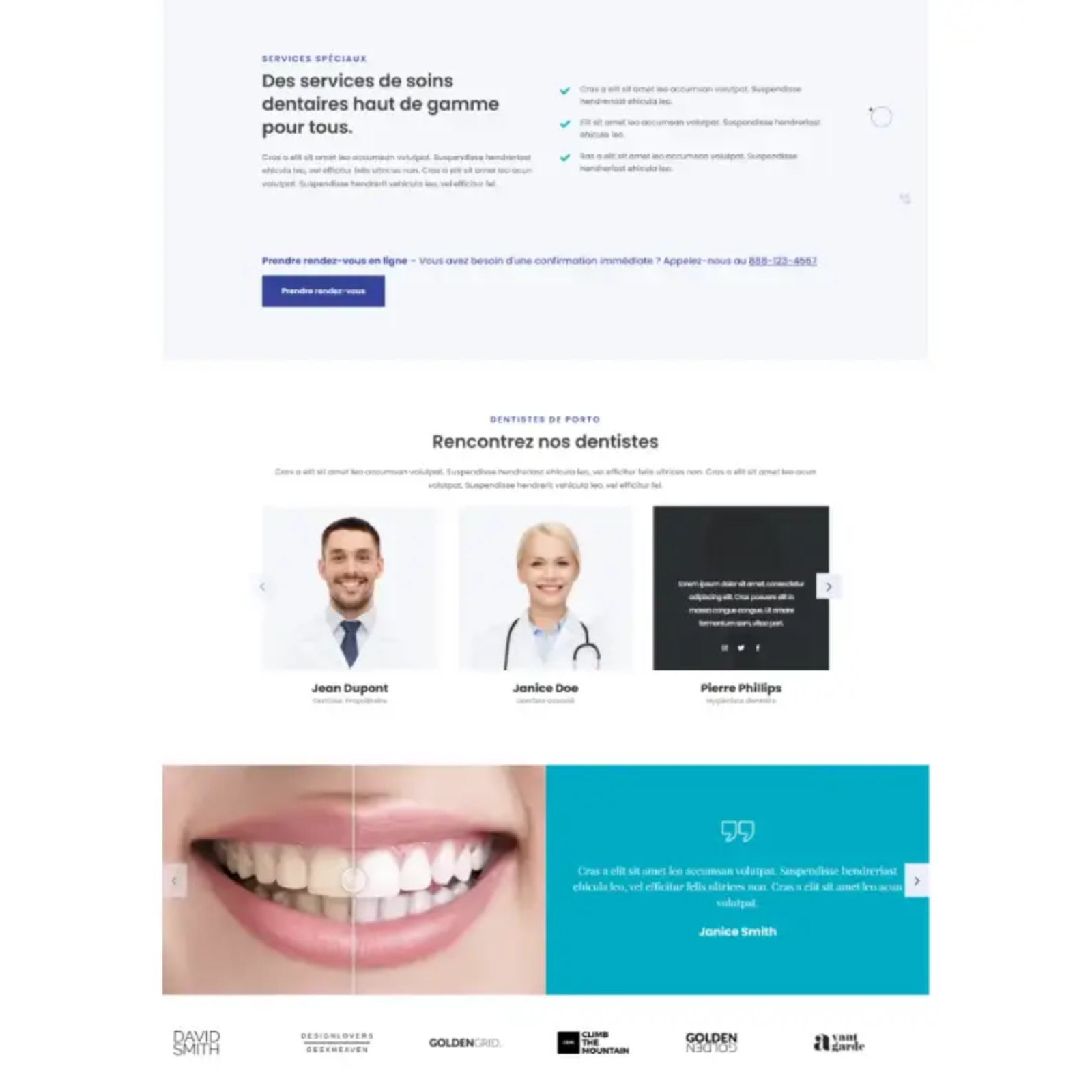 Mettez vos praticiens au premier plan avec fiches détaillées, certifications et parcours. Parfait pour humaniser le cabinet et rassurer les nouveaux patients. Entièrement personnalisable (bio, photos, mise en page) pour refléter la réalité et la valeur humaine de votre équipe.